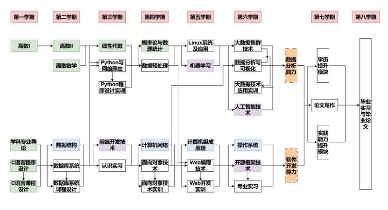 制定递进课程模块。基础阶段以高等数学、概率论与数理统计、线性代数、Python与网络爬虫、数据库系统、Linux系统及应用为核心,夯实学生数学与技术基础;进阶阶段开设Web应用开发实训、大数据集群技术、机器学习等课程,引入企业真实数据集,让学生在“处理百万级用户行为数据”“搭建实时数据监控看板”等任务中掌握核心技术;高阶阶段则聚焦行业细分领域,开设数据分析与可视化、人工智能等方向课,实现“学习内容与岗位需求”的精准对接。