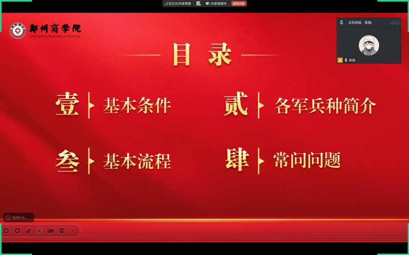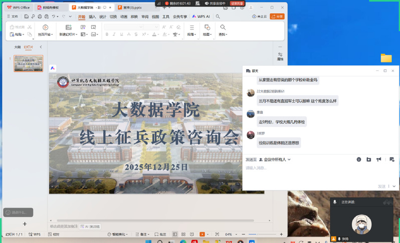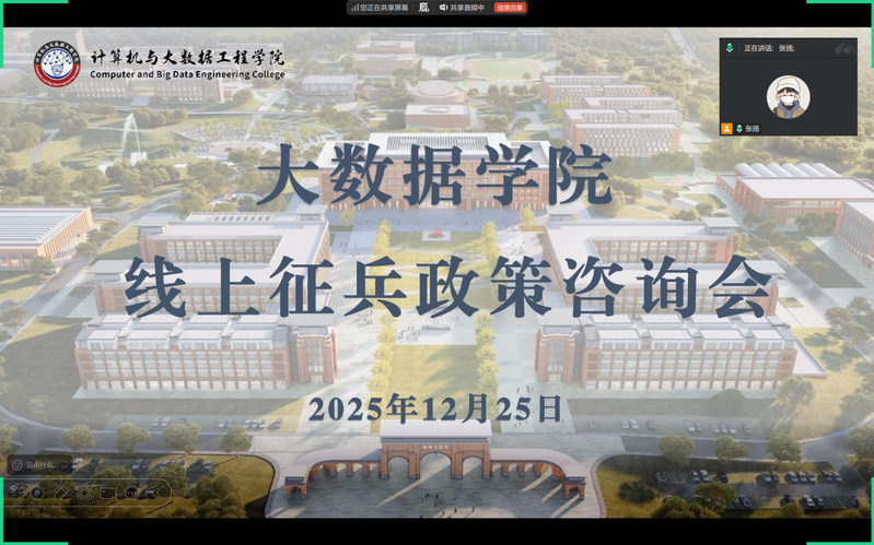 为深入贯彻落实国家征兵工作部署,进一步凝聚全院征兵工作合力,推动我院征兵工作再上新台阶,12月25日下午,我院专门面向2026届毕业班学生,精心组织了一场以 “征兵政策宣讲+现场问题解答” 为核心的线上征兵政策咨询活动。活动聚焦毕业班学生职业发展需求,通过精准解读政策、实时回应关切,为有入伍意向的学子搭建了高效畅通的信息桥梁。