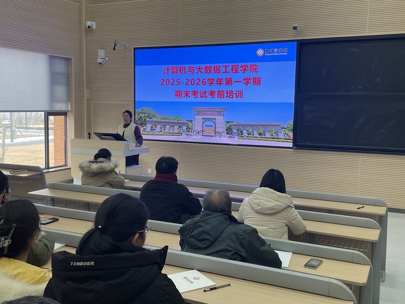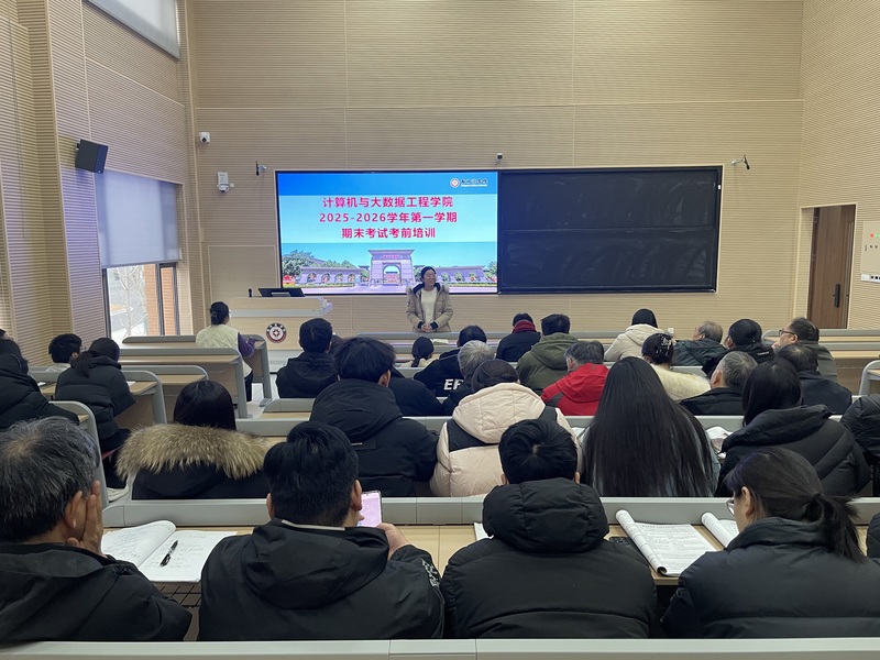 为进一步严肃考风考纪,规范期末考试管理,确保本学期期末考试工作的平稳、有序进行。1月4日下午,大数据学院在敏行楼A201教室召开了2025-2026学年第一学期期末考试工作专题培训会,会议围绕考务组织、监考规范、纪律要求等关键环节进行部署和说明。本次会议由副院长龙瑞主持,学院全体教师参会。
