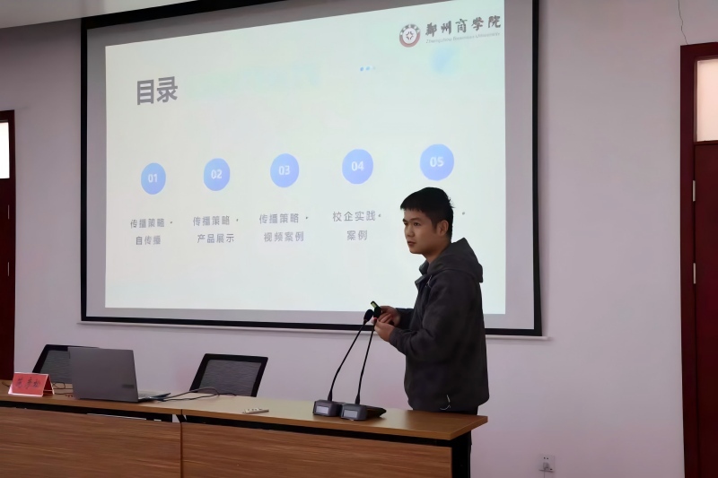 在校企实践成果展示环节,范老师重点分享了学校数智供应链专业集群建设背景下的产教融合成果。他详细介绍了师生团队协助河南瑞赛尔机械制造有限公司开展平台运营的成功经验,以及通过组织跨境电商直播大赛 “以赛促学” 的人才培养模式;特别向企业呈现了美团实训中心的阶段性建设情况,介绍了学校正在打造的高规格、专业化直播间,强调未来将与企业开展更多元的合作活动,涵盖海外社交媒体运营指导、跨境电商实操培训、人才定向输送等多个领域,为企业出海提供全链条智力与人才支持。