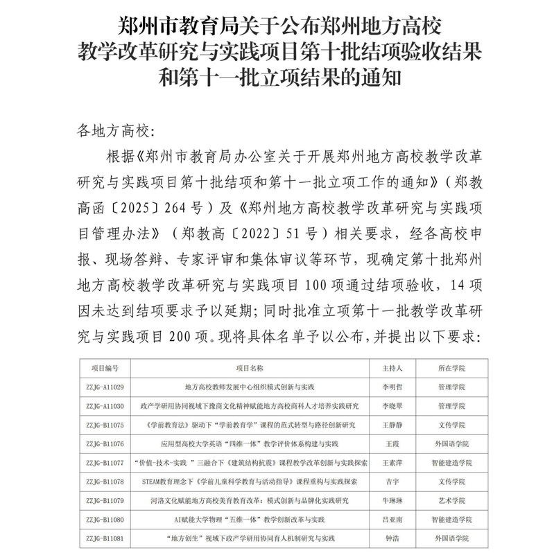 近日,郑州市教育局发布《关于公布郑州地方高校教学改革研究与实践项目第十批结项验收结果和第十一批立项结果的通知》(郑教高函〔2025〕339号),我校9项教改项目成功获批立项,立项数量在全省民办高校中位居前列,充分彰显了学校在教改建设领域的扎实基础与突出实力。