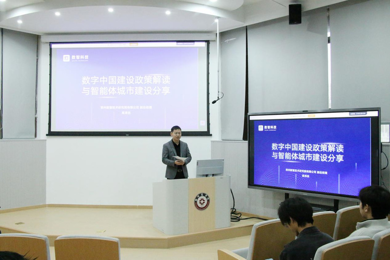 为深入学习贯彻国家数字化发展战略,将智慧城市与数字中国建设理念深度融入数智供应链专业集群建设的人才培养与科研创新体系,11月7日下午,我院特邀郑州数智技术研究院有限公司副总经理高泽民和企业管理部科研经理贺亚男在1号楼101学术报告厅作题为《数字中国建设政策解读与智能体城市建设分享》的专题讲座。讲座由我院长梁鹏主持,数字经济、金融科技专业以及参与数智供应链专业集群建设相关方向的师生共同参与。