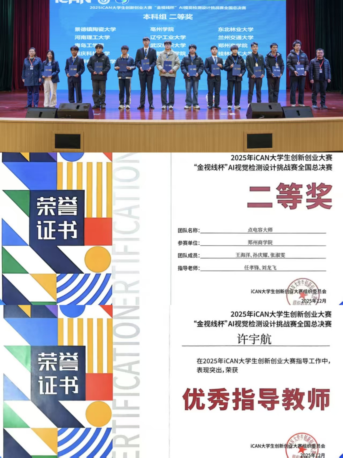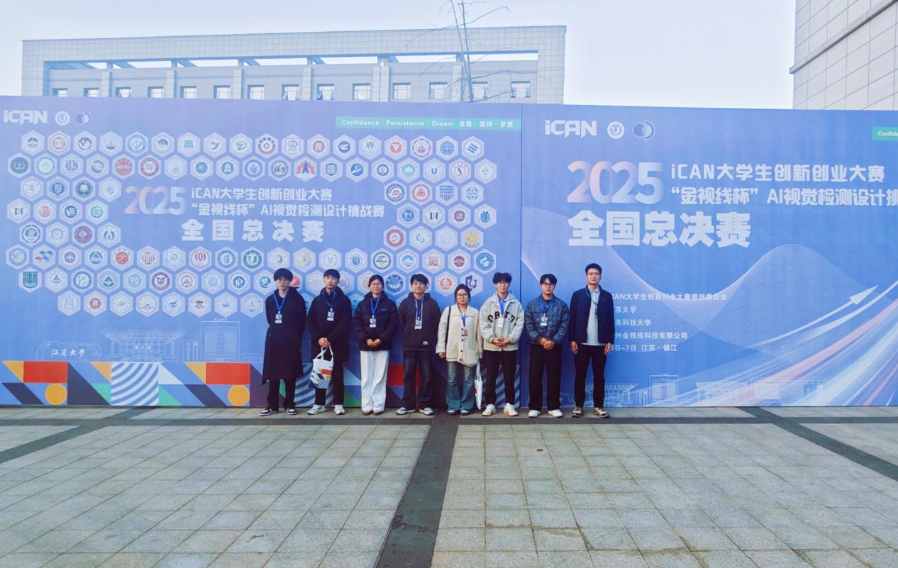 12月7日,2025年iCAN大学生创新创业大赛“金视线杯”AI视觉检测设计挑战赛全国总决赛在江苏大学圆满落幕。作为教育部认可的84项全国大学生学科竞赛之一(A类竞赛),该赛事以推动新一代人工智能技术产业化与集成应用为核心目标,是全国高校人工智能领域的高端交流平台。本次比赛共有3000余支队伍参加省赛,最终151支队伍入围全国总决赛线下赛。机电学院6名学生组成2支队伍,在刘龙飞、刘磊老师的带队下,前往江苏大学参加全国总决赛。经过激烈角逐,点灯大师队(赵云豪、王俊超、吴玥同学)荣获全国一等奖,点电容大师队(王海洋、孙庆耀、张淑雯同学)斩获全国二等奖。刘磊、许宇航老师获评“优秀指导教师”。