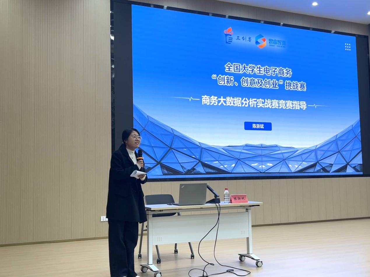 为培养传承和弘扬现代企业家精神的新商科应用型人才,锤炼学生豫商文化精神行动能力,指导学生以豫商企业为背景,积极备战第十六届全国大学生电子商务“创新、创意及创业”挑战赛,全面提升我校参赛团队在商务大数据分析实战赛道的竞技水平,12月4日,我校特邀大赛合作企业——浙江思睿智训科技有限公司的陈浙斌经理来校,为全校参赛学子带来一场内容丰富、针对性强的高质量竞赛指导讲座。本次专题指导会由管理学院院长李晓翠主持,管理学院、会计学院、金融与贸易学院全体指导老师、参赛学生及其他无课老师代表参会。