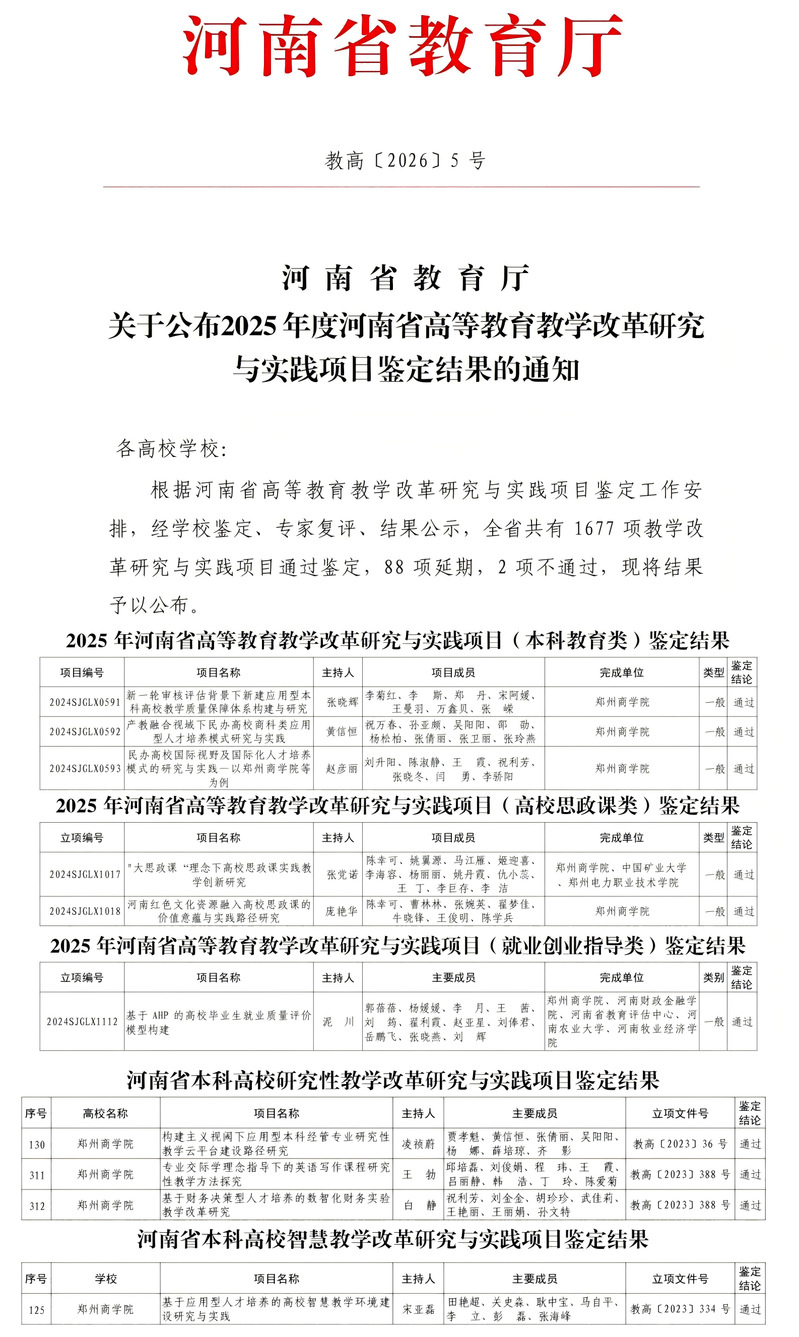 近日,根据《河南省教育厅关于公布2025年度河南省高等教育教学改革研究与实践项目鉴定结果的通知》,我校主持的10项省级教育教学改革研究项目全部顺利通过鉴定验收,标志着我校教育教学改革研究与实践工作取得阶段性重要突破。