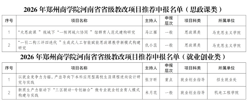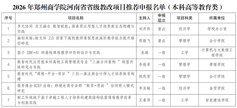 根据《河南省教育厅关于开展2026年河南省高等教育教学改革研究与实践项目立项工作的通知》(教高〔2026〕14号)文件精神,经自主申报、学院初审、教务处复审、校教学指导委员会专家评议,拟推荐《多元协同交叉融合数智赋能:高素质应用型人才培养新生态构建与实践》等11个项目申报2026年河南省高等教育教学改革研究与实践项目,具体如下:
