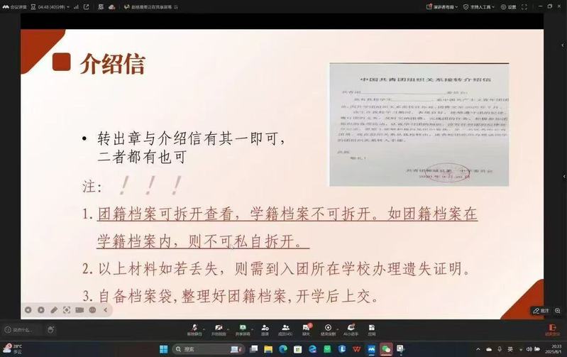 为帮助新生辅导员助理明确团组织关系转接流程,解决操作过程中常见的各种问题,助力新生辅导员助理更好地履行职责,保障迎新工作顺利进行,我院于线上召开2025级新生辅导员助理见面会。本次会议由新生辅导员助理团团长赵杨晨希主讲,会计学院行政秘书兼团委书记孙柳阳老师及全体新生辅导员助理参加。