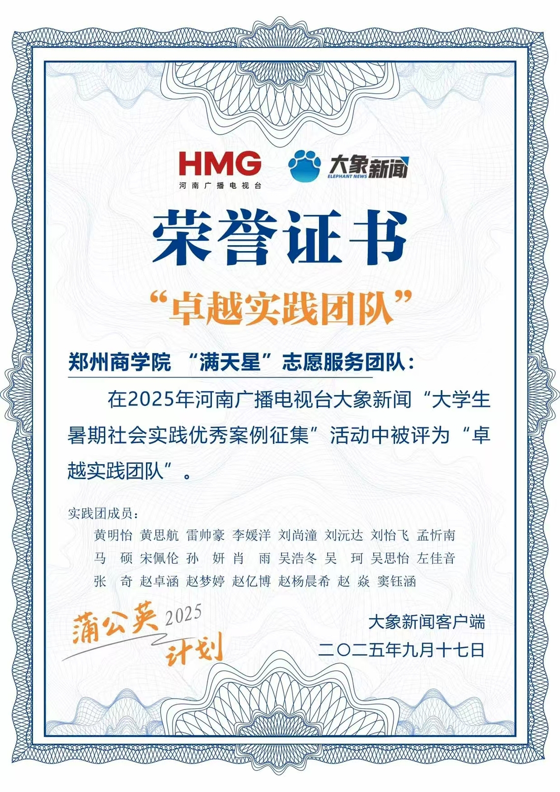 近日,由河南广播电视台大象新闻主办的2025年“蒲公英计划”评选结果揭晓,我校在众多高校中脱颖而出,再创辉煌。会计学院暑期社会实践团队——“满天星”志愿服务团队被评为“卓越实践团队”;会计学院孙柳阳、袁祥龙、李娜、康晨茜四位老师被评为“优秀指导老师”;会计学院左佳音、赵杨晨希同学被评为“卓越领航者”;会计学院赵卓涵同学被评为“社会实践先锋”。