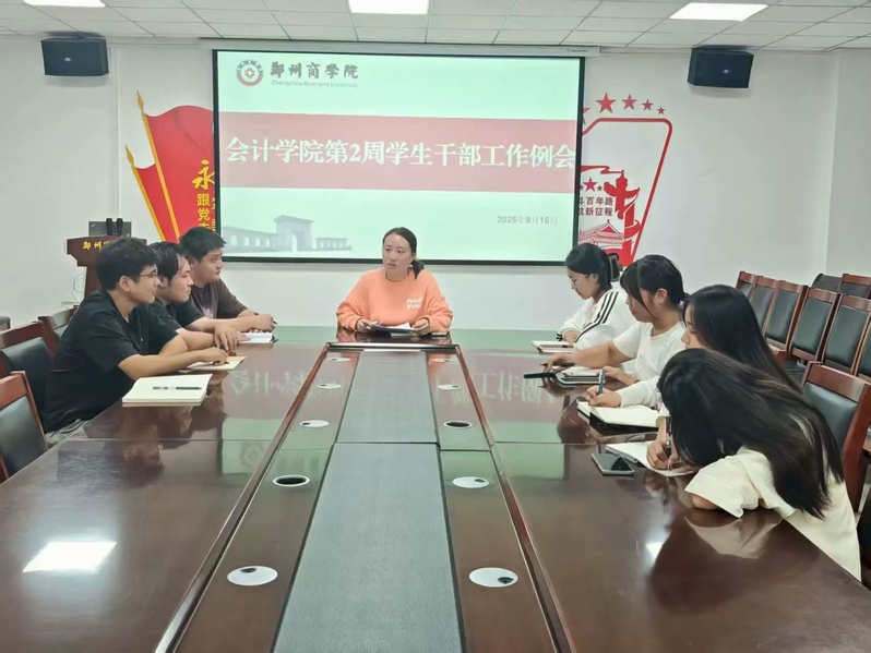 为进一步提升学生教育管理与服务水平,明确学生干部的核心职责和工作分工,保障新生入学教育和军训各项工作顺利开展。9月17日,我院在广恩楼103会议室召开第二周学生干部工作例会。本次会议由会计学院行政秘书兼团委书记孙柳阳老师主持,全体学生干部共同参会。