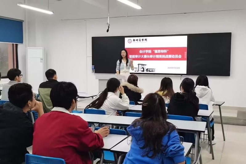 会议伊始,金蕾老师从竞赛性质、竞赛流程、竞赛内容、竞赛形式、竞赛奖项设置等相关信息,详细介绍“福思特杯”智能审计大赛和审计精英挑战赛两项竞赛,并向学生说明接下来校内选拔赛的方式,提醒学生做好时间规划和学习安排。