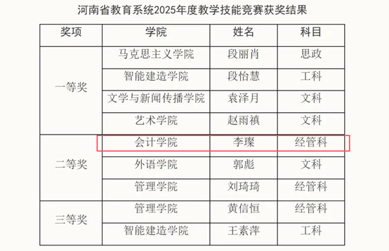 此外,在由河南省总工会、河南省教育厅联合主办,河南省教科文卫体工会和洛阳理工学院承办的河南省教育系统2025年度教学技能竞赛中,李璨老师凭借精湛的教学技艺和创新的教学方法,荣获全省高校经管科二等奖。这一成绩充分展现了我院教师优秀的教学技能与课堂驾驭能力,彰显了学院教师队伍的专业素养。