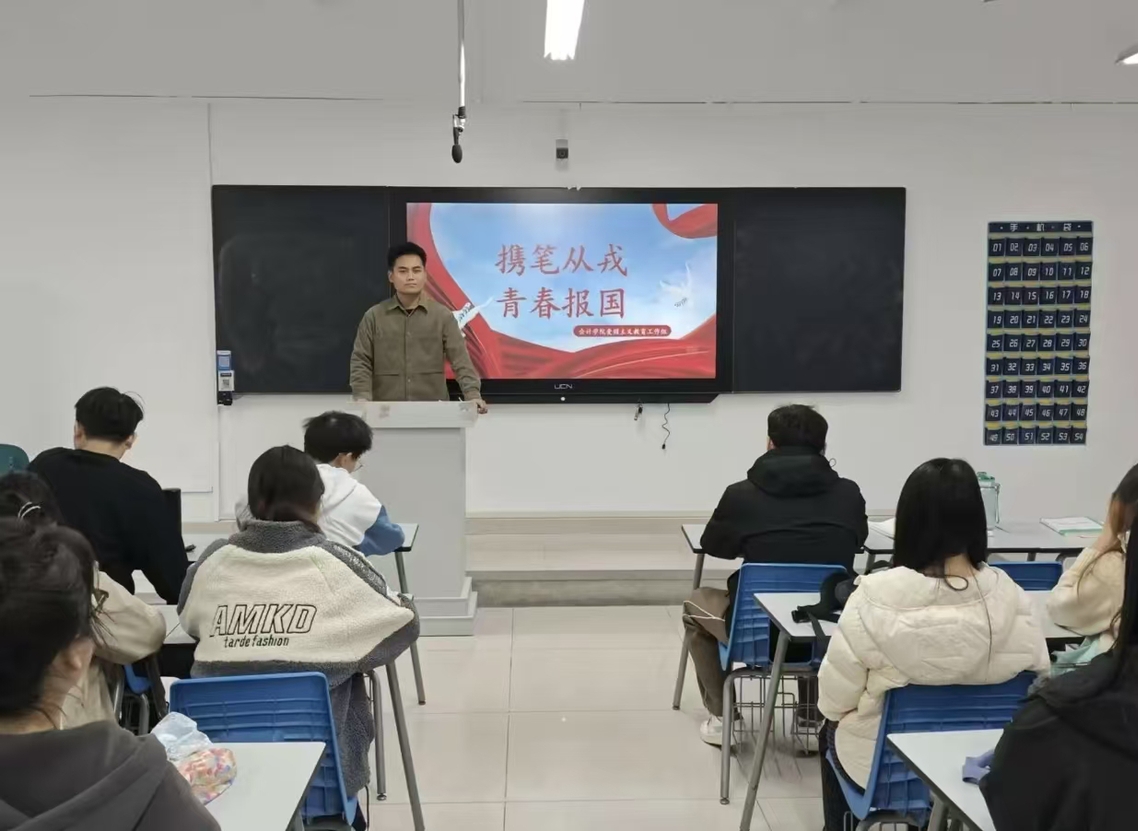 为激发青年学子参军报国的责任感与使命感,提高青年学子的爱国热情,115日,会计学院爱国主义教育工作组在广恩楼GE311教室组织开展“携笔从戎,青春报国”主题活动,为有参军意向的学生搭建政策了解与交流分享的平台。