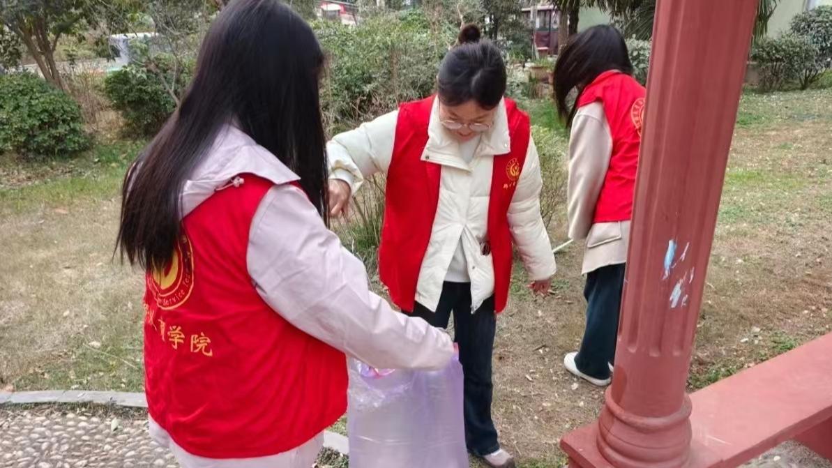 另一组志愿者则手持清洁工具,前往社区外围开展环境整治工作。他们聚焦社区广场的休闲座椅、步道缝隙及绿化带,对藏匿其中的烟头、杂物进行清理,就连墙角、树根等容易被忽略的卫生死角也细致清扫、不留遗漏。明媚的阳光下,志愿者们俯身劳作的身影格外鲜活亮眼,不仅为居民擦亮了整洁舒适的公共空间,更化作冬日社区里一道洋溢着青春朝气的风景线。