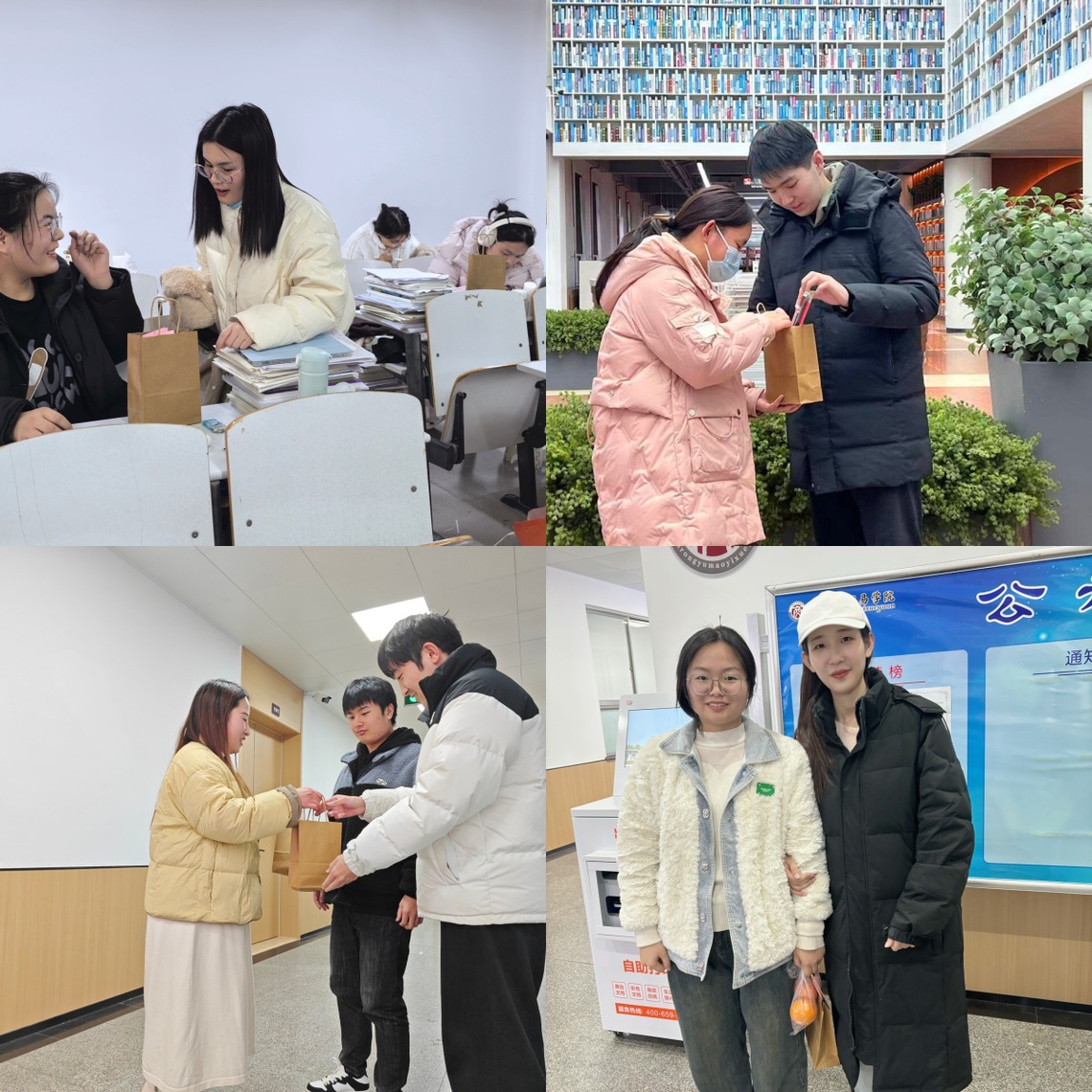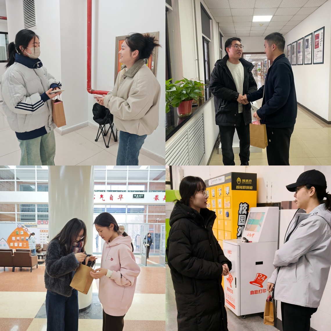 12日至15日,教师团队前往图书馆、一号楼、广恩楼等考研自修室,为学子们送上装满心意的“考研礼包”。老师们踏雪而至,向考研学子传递学院的关怀与支持,勉励大家保持良好心态、坚持到最后一刻。雪中送暖的关怀让学子们深受感动,大家纷纷表示,将把学院的鼓励转化为备考动力,调整好心态全力以赴冲刺,不辜负学院的期望。