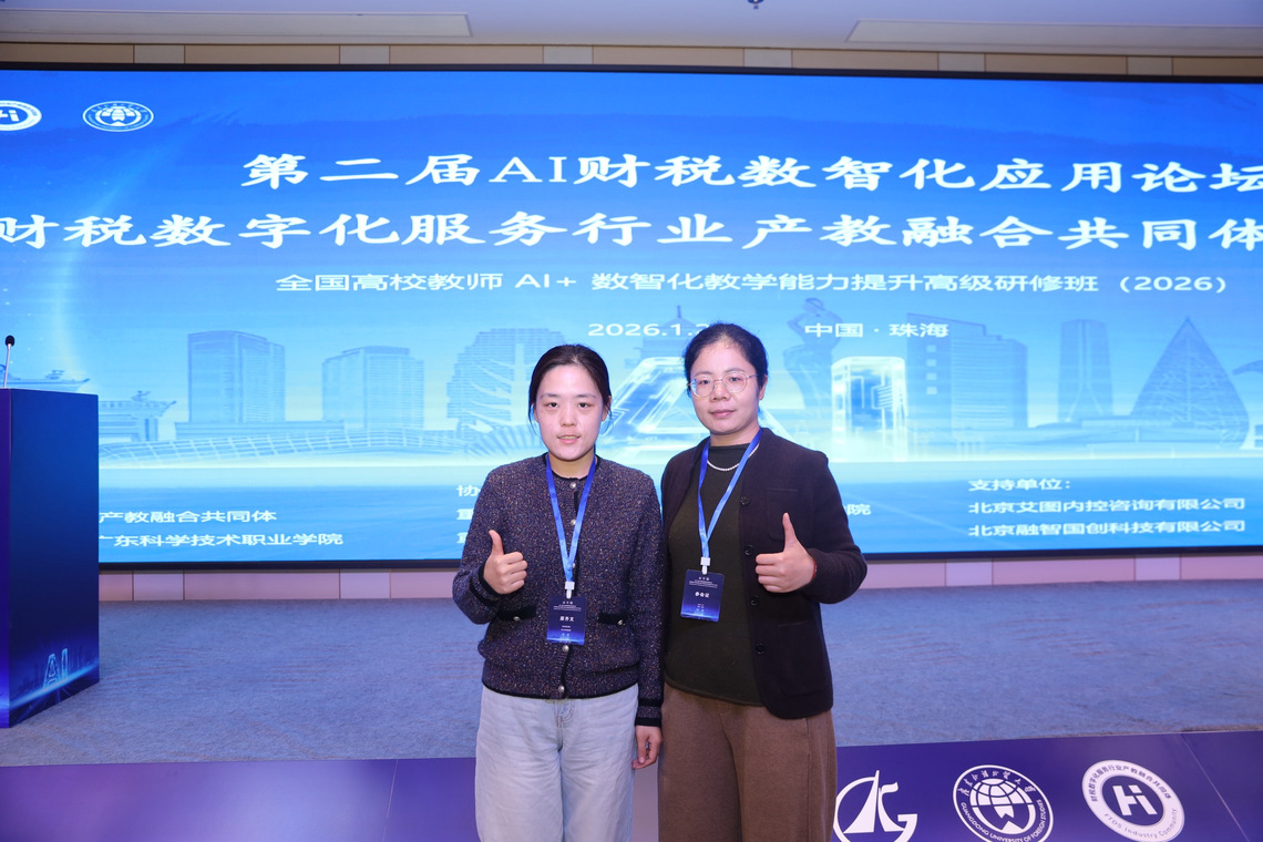 为深入推进教育数字化战略,加快人工智能与财税专业教育深度融合,提升教师数智化教学与实践能力,2026年1月26日至1月31日,我院李伟平、原齐文两位教师赴广东珠海参加第二届AI财税数智化应用论坛、财税数字化服务行业产教融合共同体2025年会暨全国高校教师“AI+”数智化教学能力提升高级研修班,与全国高校、行业企业专家共探AI赋能财税创新与产教协同育人新路径。