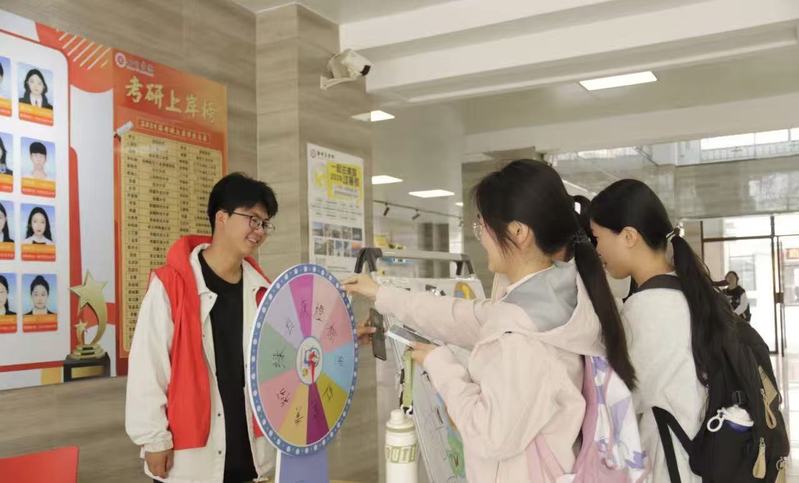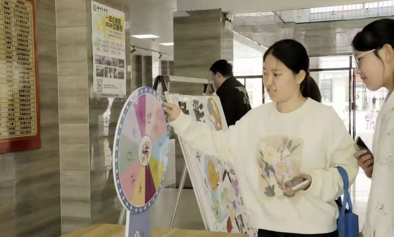 活动现场暖意融融、氛围热烈,参与活动的师生、负责组织的心理部工作人员均全程投入、热情高涨。工作人员详细讲解游戏规则后,师生们有序转动趣味转盘,指针定格的颜色,便是大家需要寻找的“宝藏色彩”。随后,大家纷纷行动起来,在广恩楼一楼大厅及周边角落认真搜寻——春日绽放的鲜艳花卉、校园设施上的彩色标识、同学们随身携带的文具与书包挂件,皆成为大家眼中的“宝藏”。