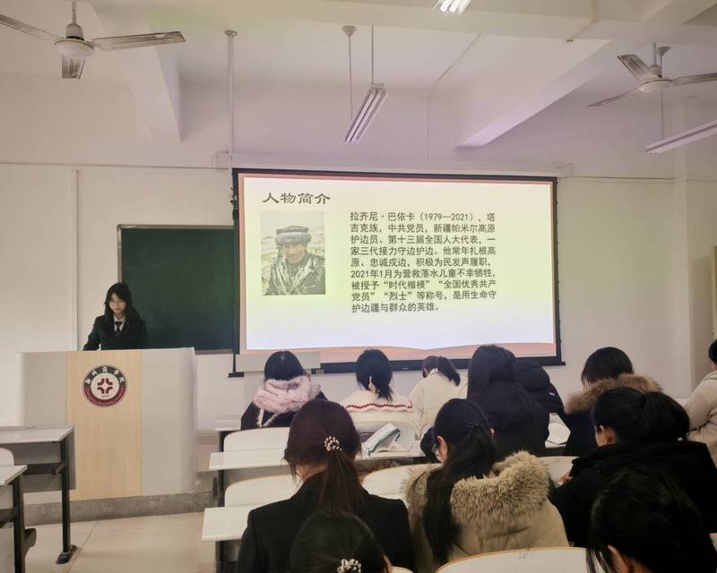 宣讲以“雪域巡边,忠护山河”为主题,从人物简介、个人事迹、精神内涵三个维度,生动讲述了时代楷模拉齐尼·巴依卡的感人事迹。拉齐尼·巴依卡是塔吉克族优秀共产党员、红其拉甫边防部队义务巡逻向导、第十三届全国人大代表。他出生于护边世家,一家三代接力守护祖国边境线。2004年加入中国共产党后,他正式接过护边接力棒,在帕米尔高原崇山峻岭间数十年如一日巡边护疆。作为全国人大代表和村委会委员,他心系群众、扎根基层,积极为民建言、办实事解难题。2021年1月,拉齐尼·巴依卡在培训期间为营救落水儿童,毫不犹豫跳入冰湖,以41岁的生命诠释了舍己为人的崇高品格。