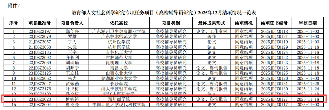 近日,由我校傅锦涛老师主持的教育部人文社会科学研究专项任务项目(高校辅导员研究)—《高校基层党组织工作督考融合研究:机理、路径与模式》(结项编号:2025JDJX0127)顺利通过结项验收。这标志着我校在高校党建与思想政治工作领域的基础理论研究与实践应用探索取得又一重要国家级成果。