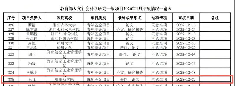 近日,教育部通报,我校王飞老师主持的教育部人文社会科学研究一般项目—《精英俘获、收入门槛与传统农区农村金融精准减贫“失准”问题研究》(结项编号:2025JXZ2481)顺利通过结项验收。这标志着标志着我校在乡村振兴与农村金融研究等商科领域取得又一重要学术进展。