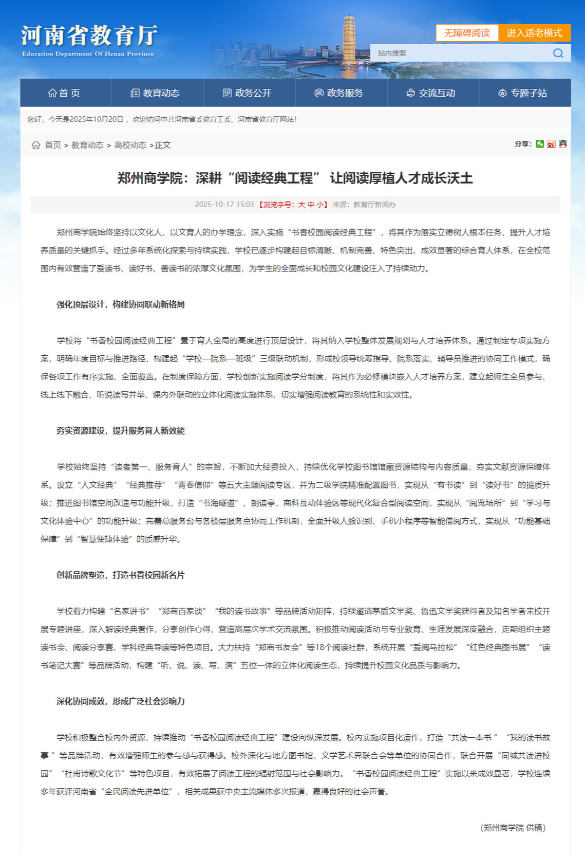 近日,我校“书香校园阅读经典工程”育人实践获河南省教育厅官方网站专题报道。该工程作为我校落实立德树人根本任务、提升人才培养质量的重要载体,经多年系统推进,已实现从课外活动向常态化育人环节的深化,逐步成为学生成长过程中不可或缺的“心灵必修课”。