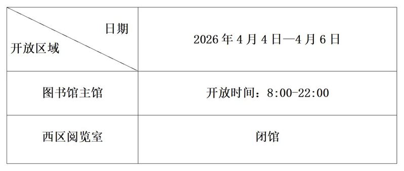 根据学校通知,2026年4月4日一4月6日为清明节假期。为方便假期读者借阅,图书馆清明节假期开放时间如下: