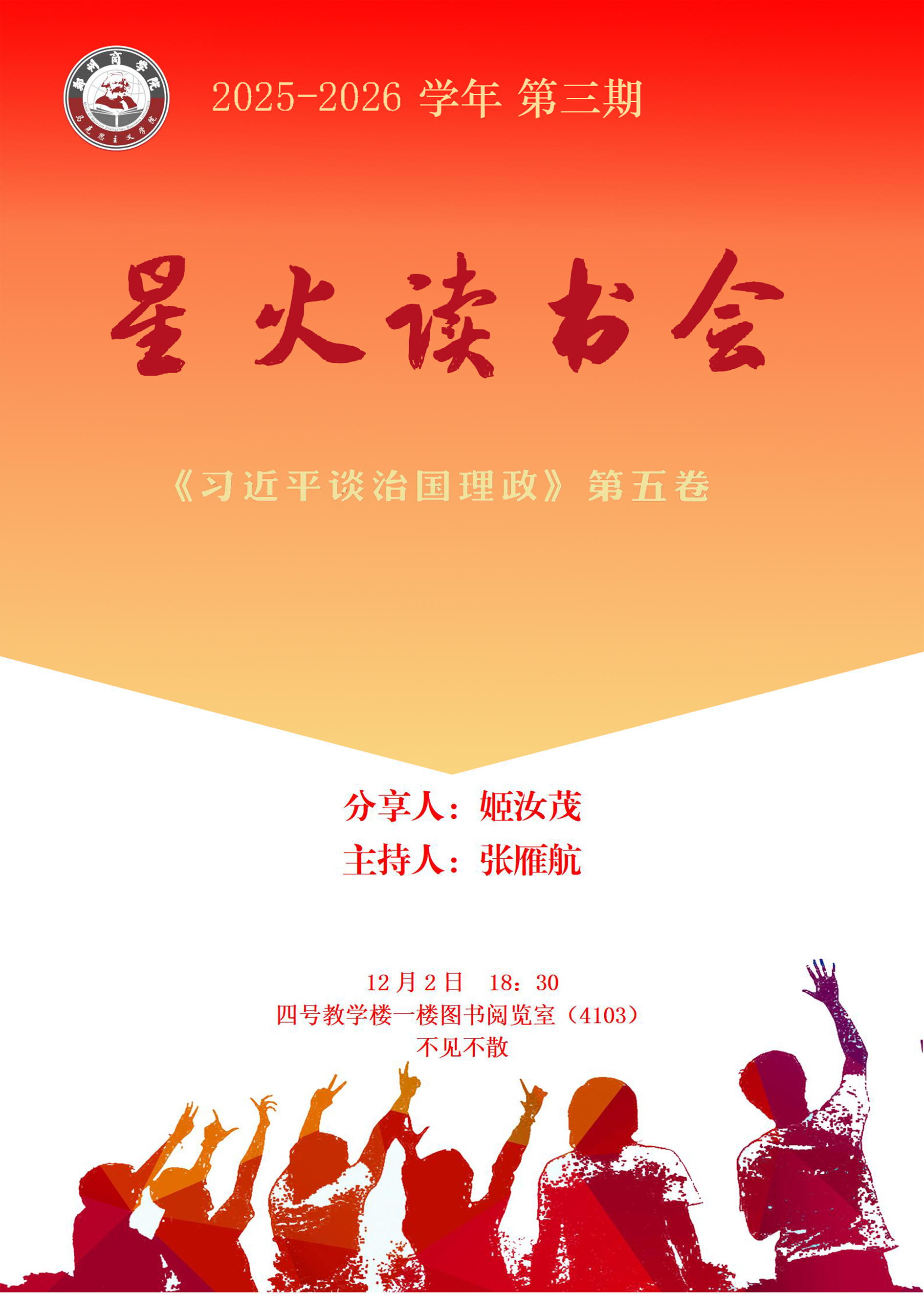 为引导广大师生深入学习经典著作,汲取思想力量,筑牢信仰之基,马克思主义学院将举办2025—2026学年第三期“星火读书会”活动。现将有关事项预告如下: