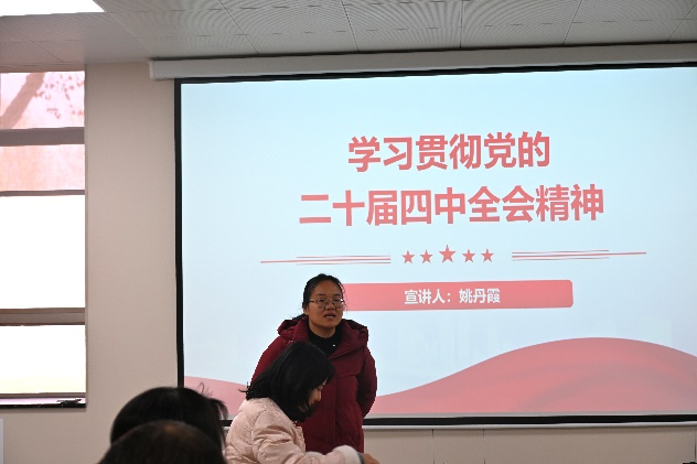 党支部书记姚丹霞围绕党的二十届四中全会精神作专题宣讲,强调要把学习全会精神作为首要政治任务,把教学工作和党的建设相结合,统筹抓好岁末年初各项工作,以实干实绩检验学习成果。