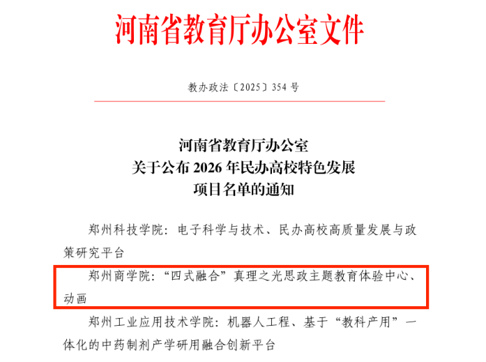 近日,河南省教育厅办公室发布《关于公布2026年民办高校特色发展项目名单的通知》(教政法〔2025〕354号),我院申报的特色发展项目“‘四式融合’真理之光思政主题教育体验中心”成功获批立项,这是我院不断推进思政课教育教学改革、创新实践育人模式取得的重大突破。