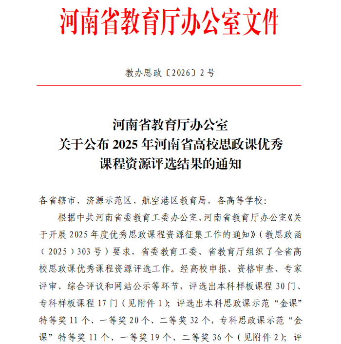 近日,河南省教育厅办公室公布《关于2025年河南省高校思政课优秀课程资源评审结果的通知》(教办思政〔2026〕2号),我院李鹏飞老师获中华优秀传统文化融入高校思政课优秀案例一等奖,姚瑞老师获大中小学思政课一体化同题异构优秀课例二等奖。两位教师的获奖,充分彰显了我校思政课改革创新的扎实成效,为马克思主义学院专业建设注入强劲动力。