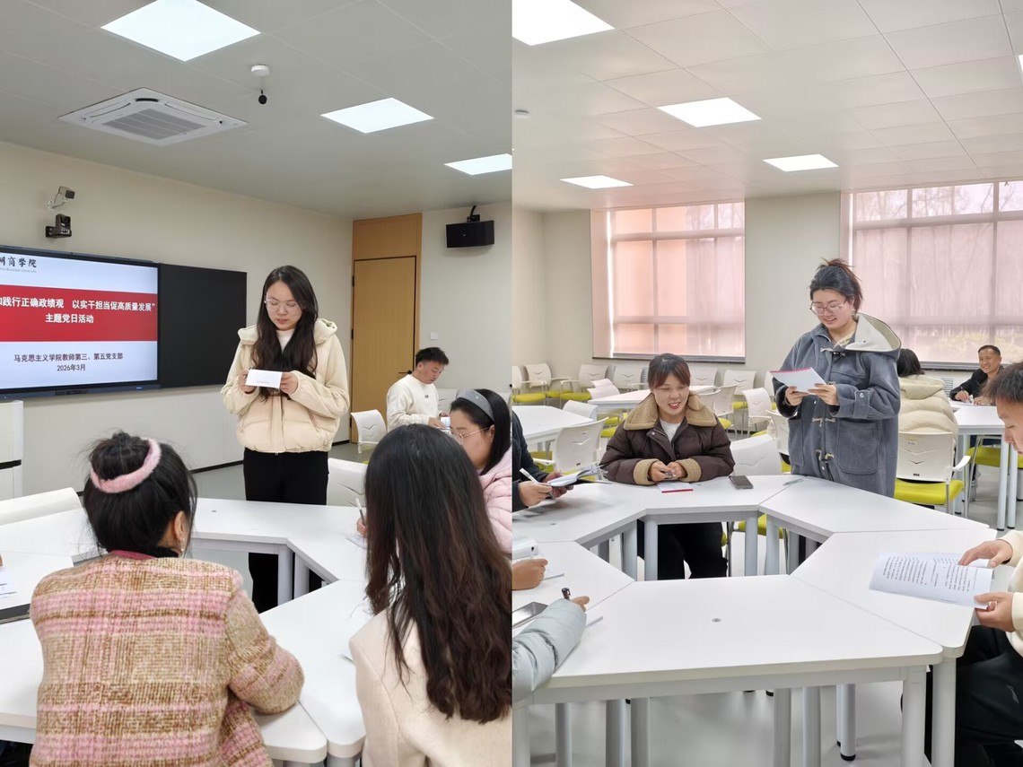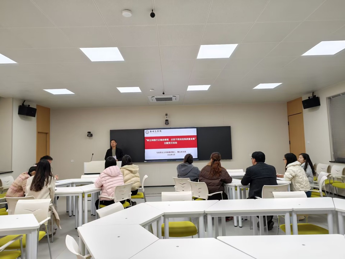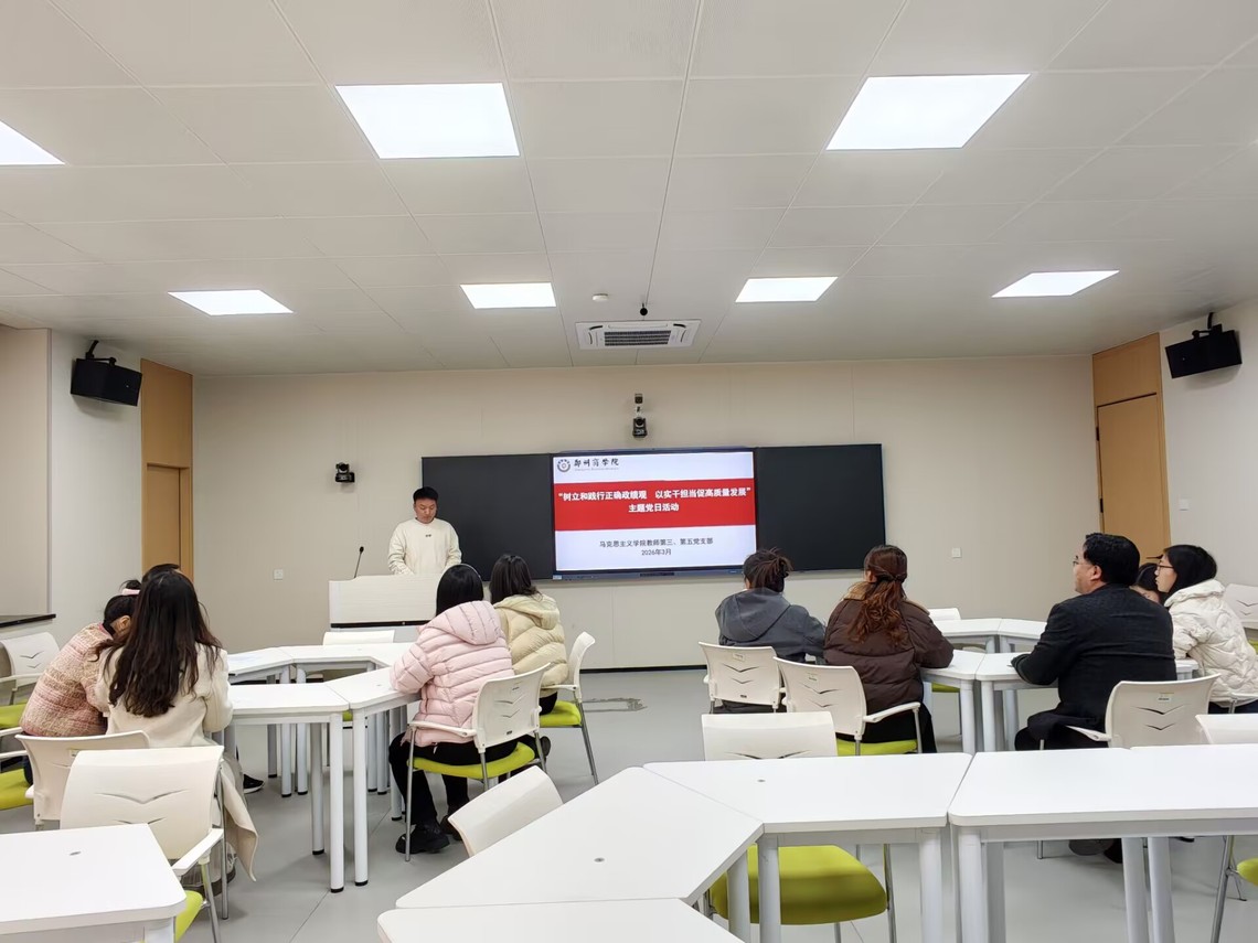 3月18日下午,马克思主义学院教师第三党支部和教师第五党支部在一楼智慧教室联合开展“树立和践行正确政绩观 以实干担当促高质量发展”主题党日活动。