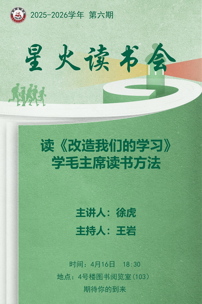 真理之光,引领前行;思想盛宴,共探新知。马克思主义学院星火读书会,诚邀全体师生共品经典、共悟真知、共担使命!