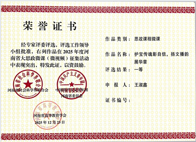 近日,河南省社会科学界联合会、中国共产主义青年团河南省委员会、河南省高等教育学会联合发布《关于公布2025年度河南省大思政微课(微视频)征集活动评选结果的通知》(豫社科联字〔2025〕10号),我院教师王淑鑫、周雨卉和李星煜表现突出,分别获得一等奖和三等奖。