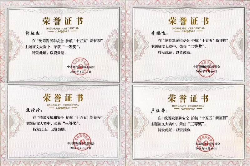 近日,由校党委主办的“统筹发展和安全 护航‘十五五’新征程”主题征文活动圆满落幕。在本次活动中,我院教师提交了多篇兼具思想深度与实践温度的优质作品,经评审专家严格评审与综合评议,我院的四篇参赛作品在理论深度、现实关照、表达创新与育人实效等方面表现突出,分别荣获一、二、三等奖。