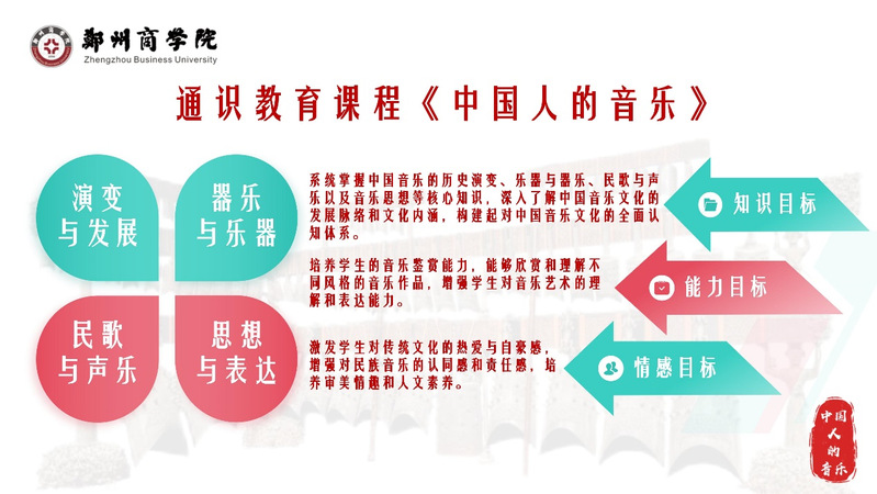 《中国人的音乐》是一门面向大学本科生的通识教育课程,旨在通过对中国音乐文化的系统介绍,拓宽学生的知识面,培养学生的文化素养和审美能力。课程内容涵盖音乐的历史演变、乐器与器乐、民歌与声乐、戏曲艺术以及音乐思想等多个方面,使学生在学习过程中不仅了解音乐知识,还能深刻感受到中国文化的博大精深。