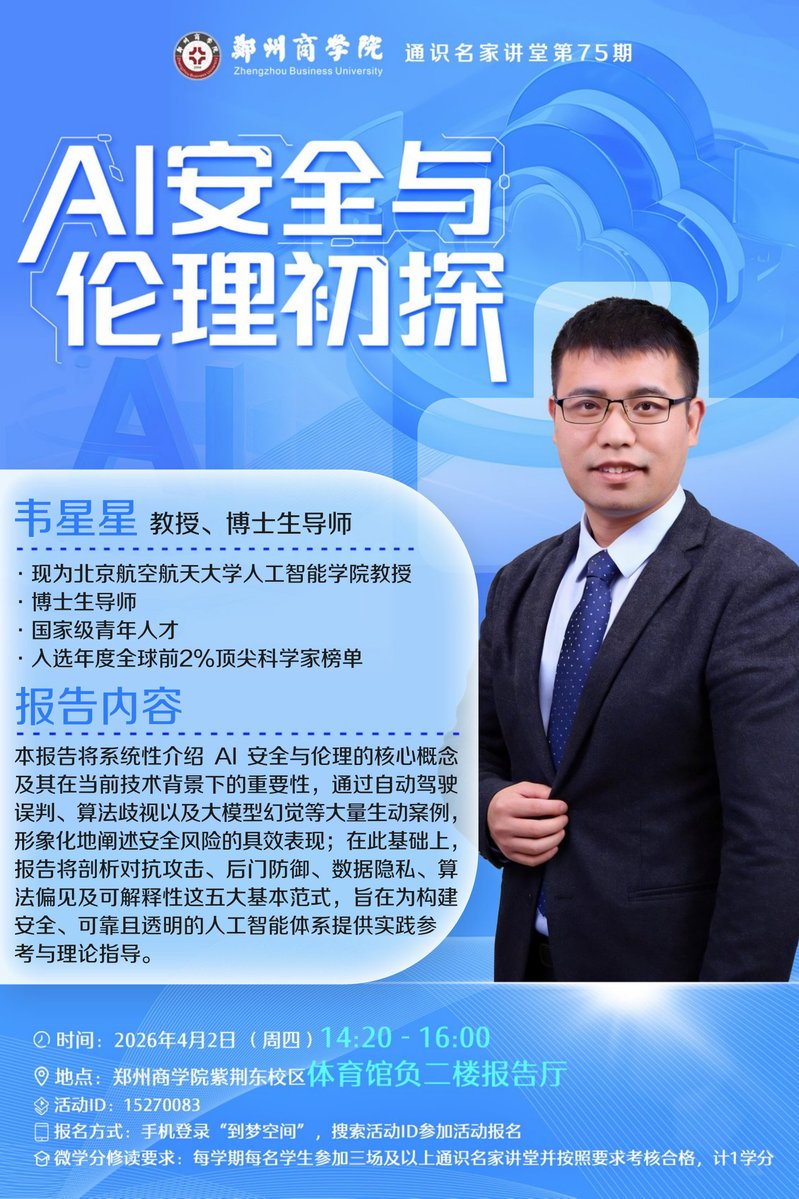 韦星星,北京航空航天大学人工智能学院教授,博士生导师,国家级青年人才,入选年度全球前2%顶尖科学家榜单。主要研究方向为计算机视觉、安全可信人工智能。在TPAMI, IJCV和CVPR, ICCV等人工智能领域顶级期刊和会议发表学术论文100余篇(其中TPAMI、IJCV论文11篇,ESI高被引论文5篇),授权发明专利20余项(其中2项已经成果转化)。作为负责人主持科技部“新一代人工智能”重大项目课题、国家自然科学基金面上项目(2项)、青年项目、军委科技委主题项目、军兵种预研项目、华为/腾讯校企合作项目。荣获国防技术发明奖一等奖(序3),在国际顶会举办的重要竞赛中获得冠亚军5项,优秀奖5项。