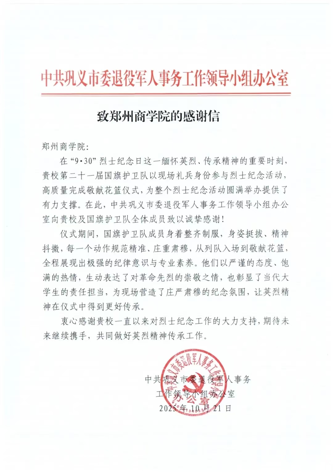 我校国旗护卫队收到巩义市委退役军人...