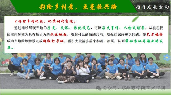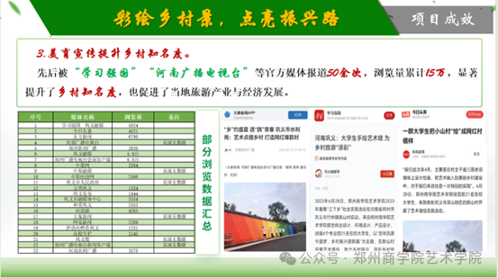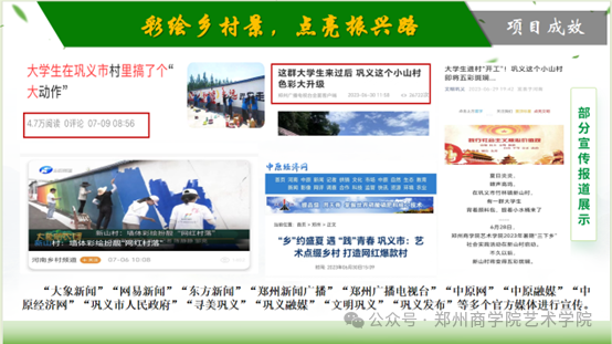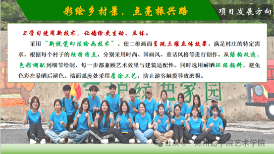 “郑州商学院艺术学院‘丹青行者’文明实践队”成立于2023年,团队始终秉承着“用画笔丈量乡土,让色彩点亮乡村”的初心,墙绘覆盖巩义市竹林镇、涉村镇、河洛镇等10余个乡镇,为大学生搭建“知行合一、学以致用”的广阔平台,将专业技能转化为服务乡村的实际行动。活动先后被“学习强国”“河南广播电视台”等官方媒体报道50余次,浏览量累计15万,受到了社会各界的一致好评。