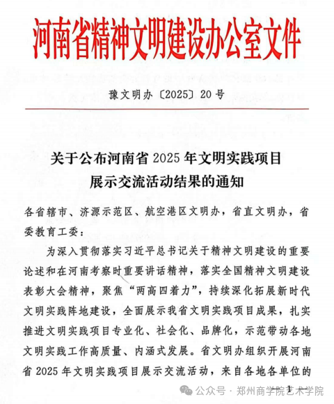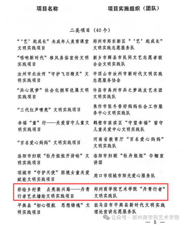 近日,河南省精神文明建设办公室下发《关于公布河南省2025年文明实践项目展示交流活动结果的通知》,我校艺术学院申报的“彩绘乡村景 点亮振兴路——丹青行者艺术墙绘文明实践项目”凭借精准的服务和创新的模式以及显著的活动成效,荣获全省二类项目,取得学校文明实践项目省级成果零的突破。