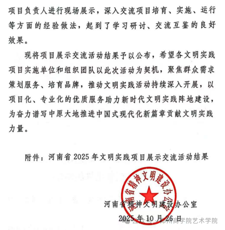 此次展示不仅是对艺术学院文明实践工作的肯定,也为艺术学院提供了一次与河南省各单位交流互鉴的重要平台。下一步,艺术学院将以此活动为契机,持续推动文明实践项目内涵建设,促进志愿服务与学校和地方发展深度融合,努力为中原更加出彩的新篇章贡献青春力量。