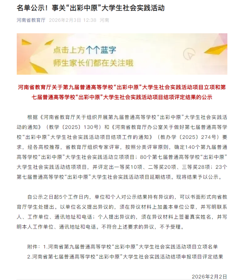 “出彩中原”大学生社会实践活动由河南省教育厅统一组织,旨在遴选培育形式新颖、内容丰富、成效突出、可借鉴、可推广的社会实践活动项目,是全面贯彻新时代育人工作新理念、新战略、新举措的具体实践。此次项目成功立项,充分体现了我校实践育人工作效能的不断提升。