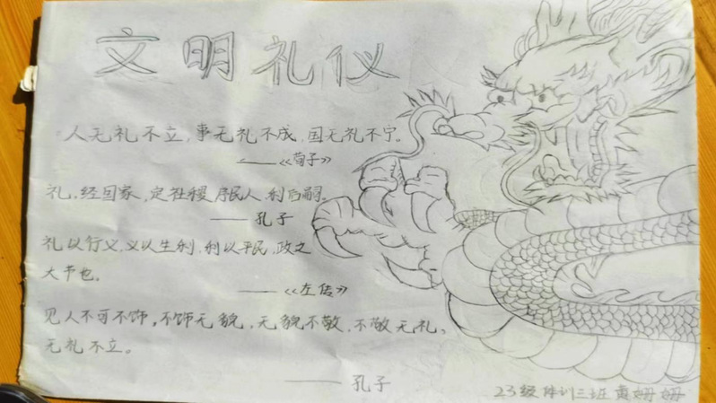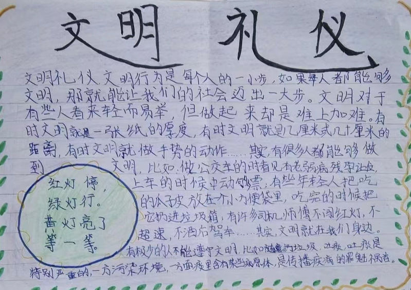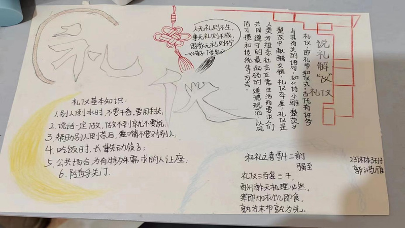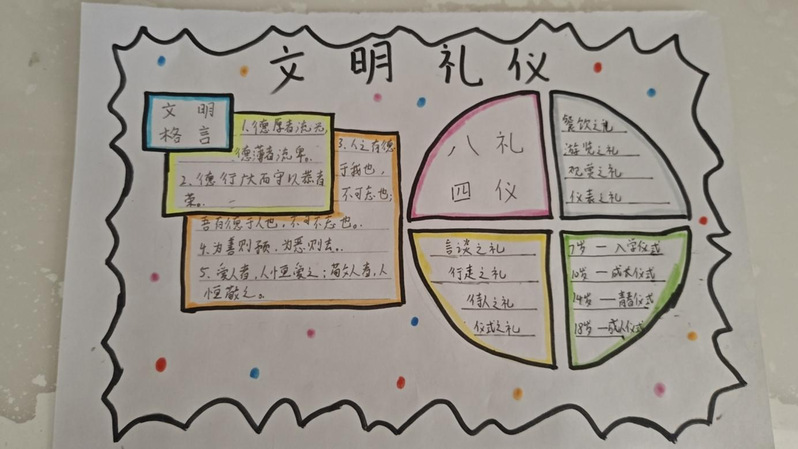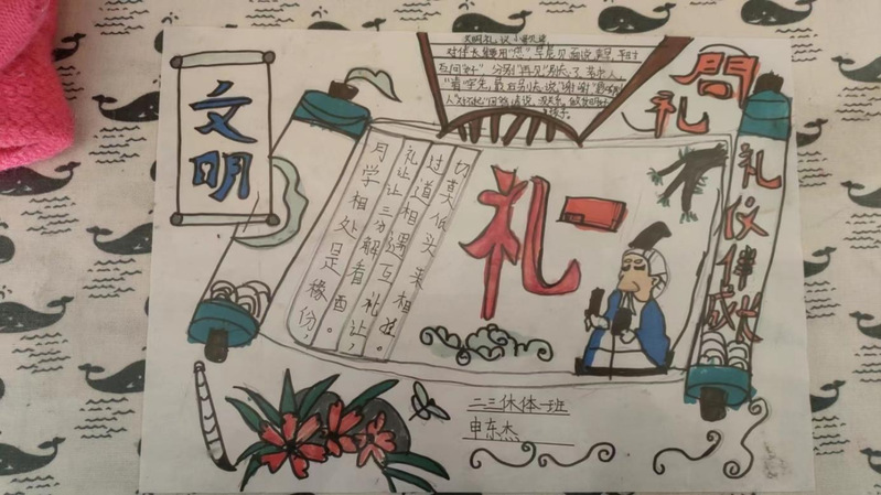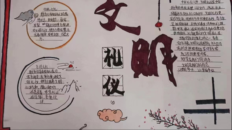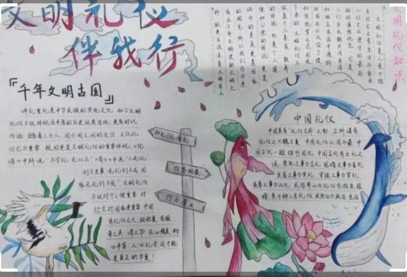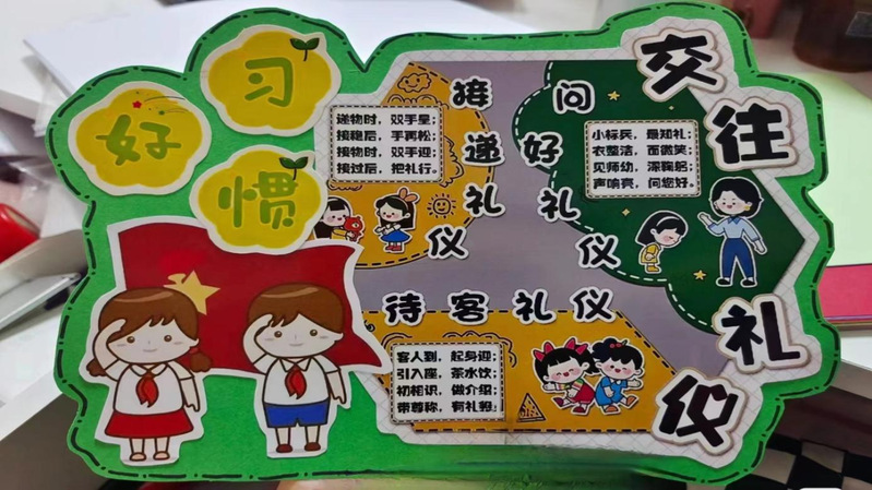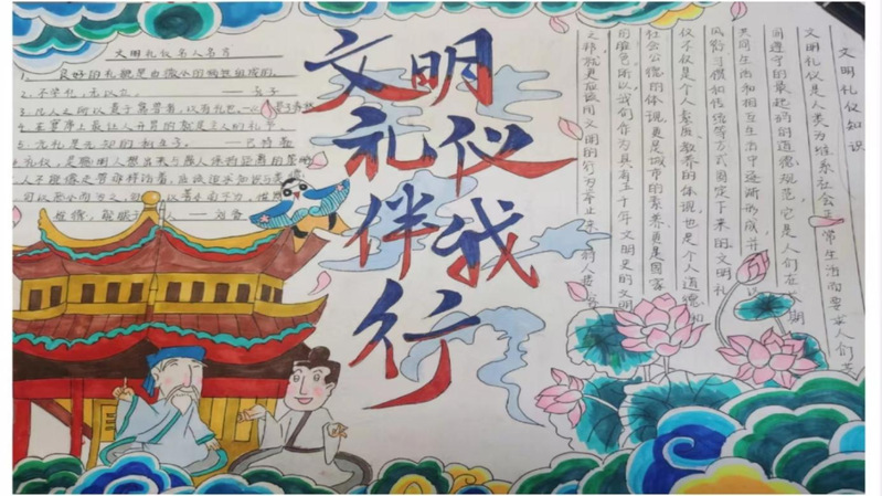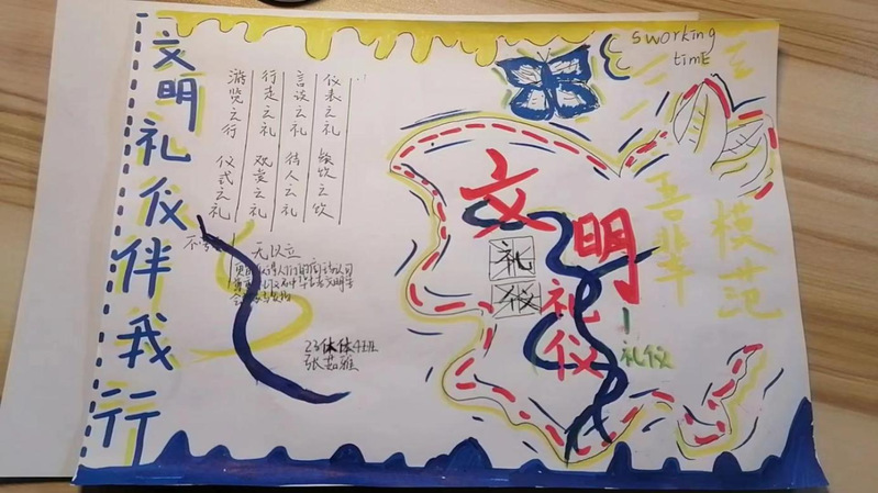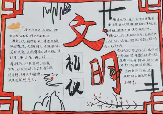 活动伊始,通过制作与文明礼仪知识有关的卡片或手抄报,并且通过向亲人朋友展示和分享这一举措,使同学们增强对礼仪的理解和认识,从而提高个人文明礼仪修养。通过精心设计和编写卡片或手抄报,能够以简洁明了的方式呈现礼仪的要点和规范,帮助人们更好地学习和掌握礼仪知识。文明礼仪是指社交行为中表现出来的符合一定文化规范的良好举止和行为,它是人际交往中的一种良好的行为表现和道德规范,体现了人类文明进步的精神文明。礼仪是社会文明进步的载体,正所谓“礼者,天地之序也”,要继承弘扬祖国优秀的文化传统,加强社会主义精神文明建设,文明礼仪教育是其中重要的一项内容。