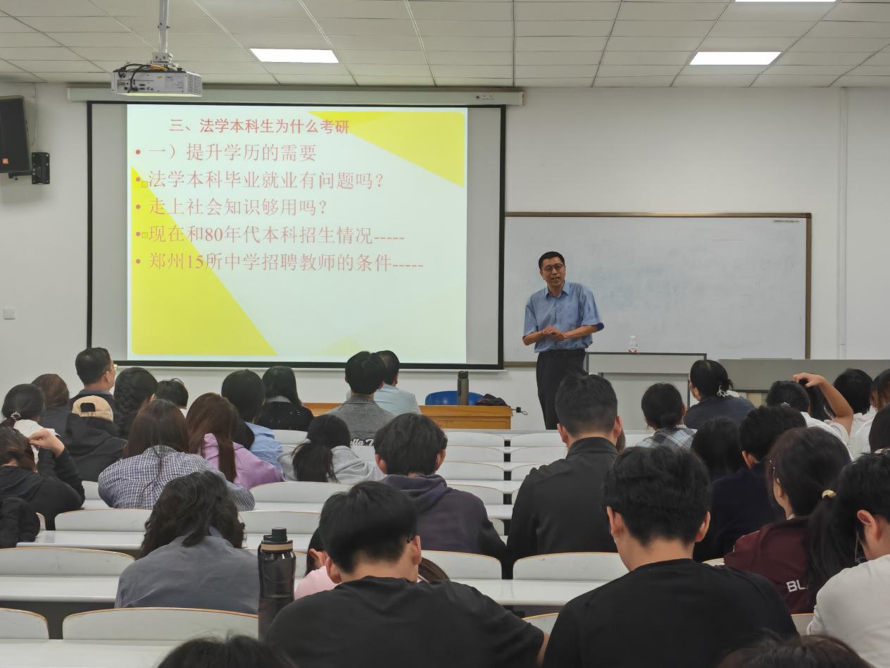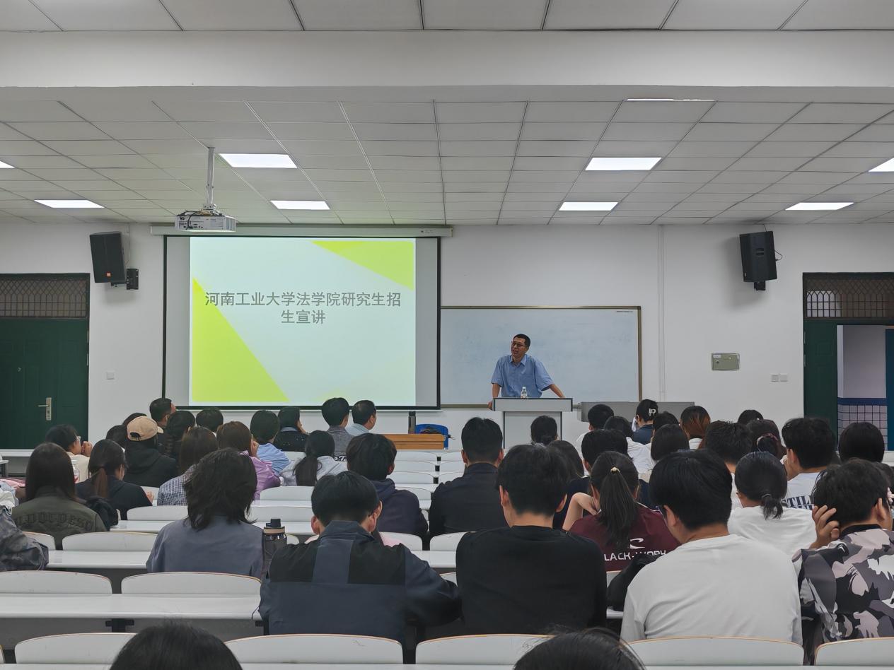 随后,李文江教授详细介绍了“河南工业大学学校概况、学科专业、人才培养及法学院概述、师资力量”。他指出,河南工业大学作为河南省重点建设高校,始终坚持以立德树人为根本,以服务国家和地方发展为己任,在学科建设、人才培养、科学研究等方面取得了显著成就。学校的法学学科作为重点发展的学科之一,拥有完善的课程体系和优质的教学资源,致力于培养具备扎实理论基础、较强实践能力和创新精神的复合型法律人才。法学院汇聚了一批学术造诣深厚、教学经验丰富的师资队伍,其中不乏国家级、省级优秀教师与行业专家,同时还与众多企业、律所、司法机关建立了实践教学基地,为学生提供了充足的实习与实践机会,助力学生将理论知识转化为实际应用能力。李教授表示,河南工业大学法学院始终秉持开放办学的理念,欢迎郑州商学院的学子报考,学校将为考研学生提供全方位的培养与支持。
