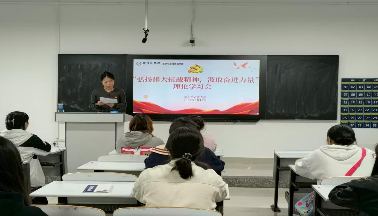 为引导广大师生弘扬伟大抗战精神,坚定不移走中国特色社会主义道路,传承红色基因,汲取奋进力量,奋力推进强国建设、民族复兴伟业。9月19日,我院学生第六党支部于自力楼206组织召开专题学习会。本次会议围绕“弘扬伟大抗战精神,汲取奋进力量”展开。