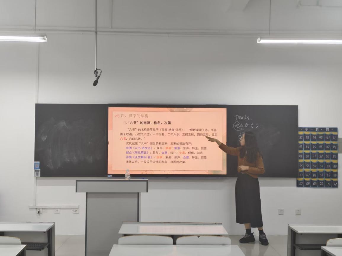 汪杰老师讲授了古代汉语“六书”中的象形造字法。她通过“日、月、山、水”等字例,演示了象形字的构成原理与演变。