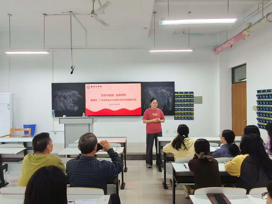 为深入推进学院杜甫文化建设高地,推动专业建设与地方文化深度融合,9月30日,我院新传教研室召开新闻学、广告学专业2026届毕业论文选题研讨会。本次研讨会紧扣“杜甫文化”主题,重点探讨如何将杜甫文化与毕业论文选题相结合,拓展学科研究的新方向,会议由新传教研室主任许明月主持。