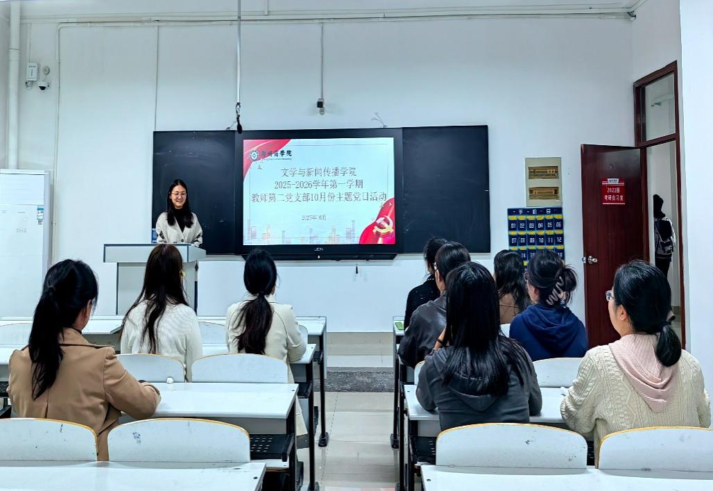 为深化理论武装、凝聚发展共识,以最佳状态迎接本科教育教学审核评估,10月16日,教师第二党支部在H209教室举办了以“党建引领聚合力,奋楫扬帆迎评估”为主题的党日活动,活动由组织委员郑梦瑶老师主持。