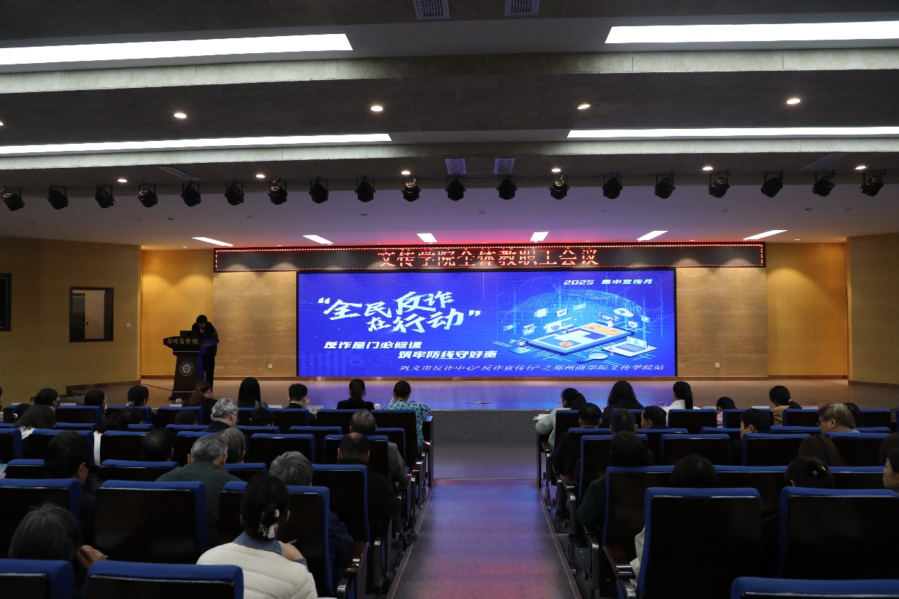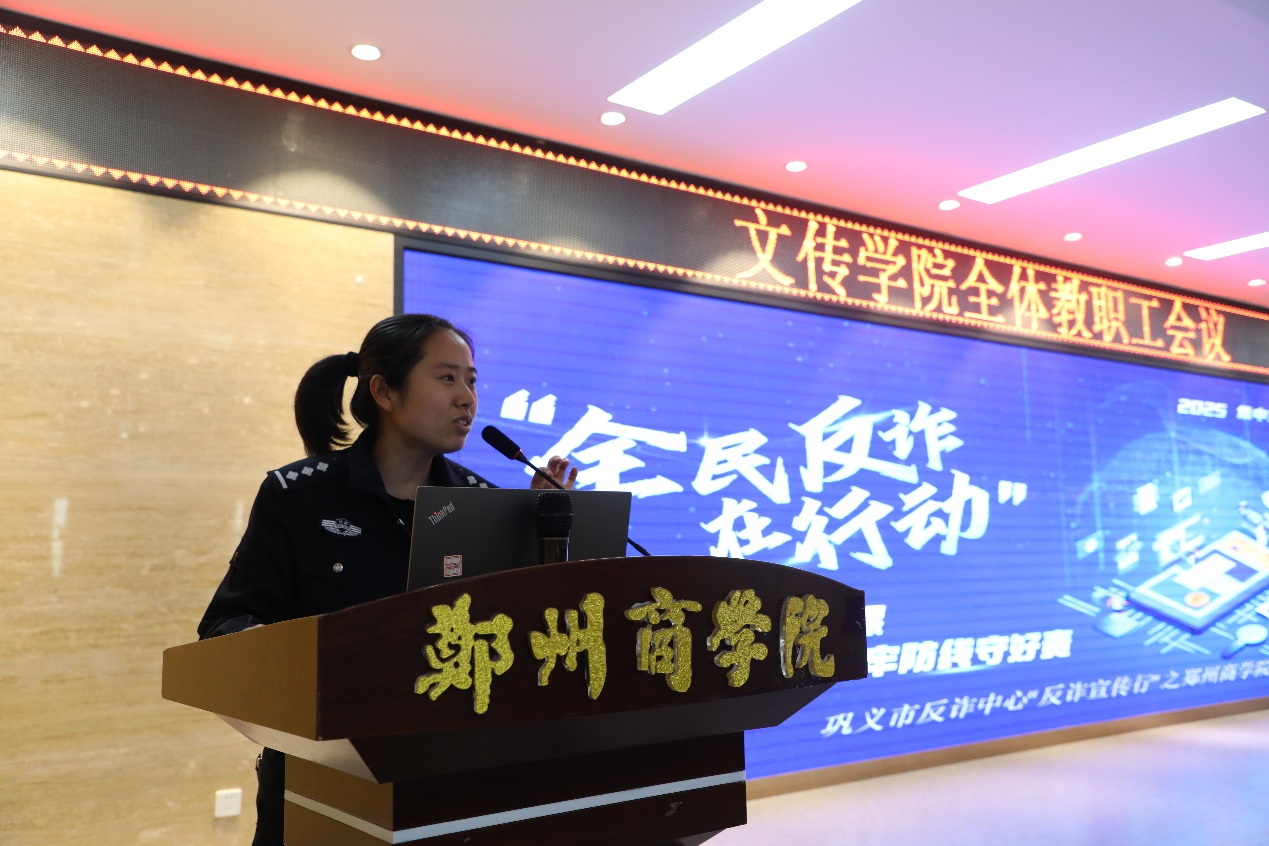 为进一步增强全院教职工的反诈防骗意识,筑牢校园安全防线,10月16日下午,文传学院在自力楼三楼报告厅召开第7周全体教职工会议,特邀紫荆路派出所民警李丹丹同志开展以“反诈是门必修课 筑牢防线守好责”为主题的防诈骗宣传讲座。文传学院全体教职工参加了本次会议。