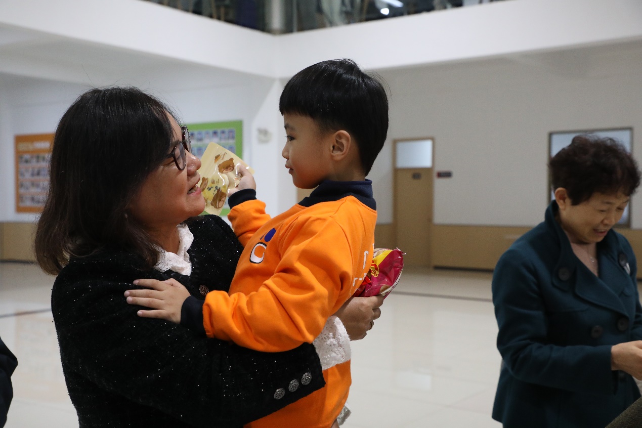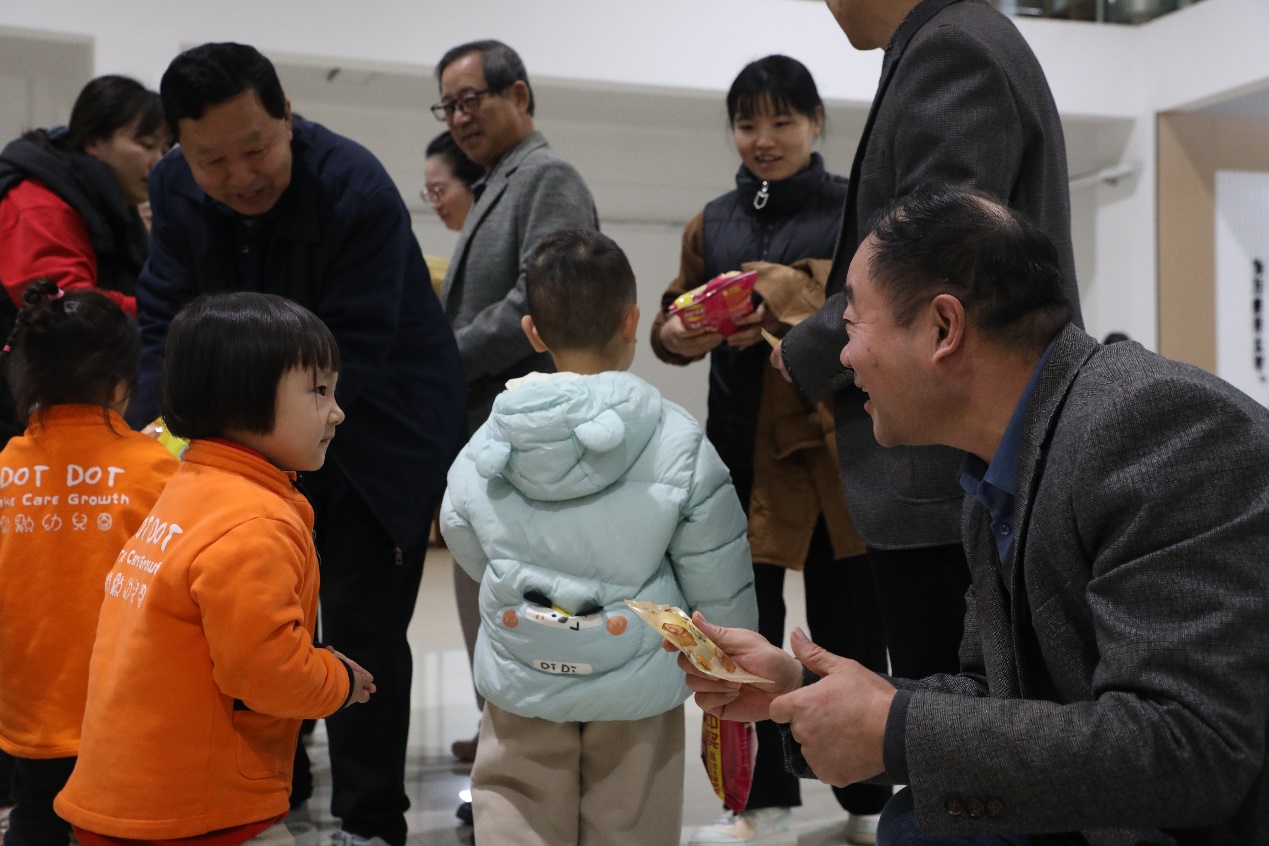 随后,点点幼儿园的小朋友们在老师的陪伴下走进学院大厅,与等候在此的银龄教师展开温馨互动。孩子们将亲手制作的小饼干送到银龄教师手中,银龄教师也回赠了精心准备的礼物,老少互赠、情意交融。接着,小朋友们表演了与重阳节相关的歌曲和手势舞,稚嫩的歌声与真挚的表演赢得了阵阵掌声。此外,新传教研室霍华民教授还将亲手书写的一幅书法作品赠予点点幼儿园,以笔墨寄情,表达对幼儿教育工作的支持与感谢。