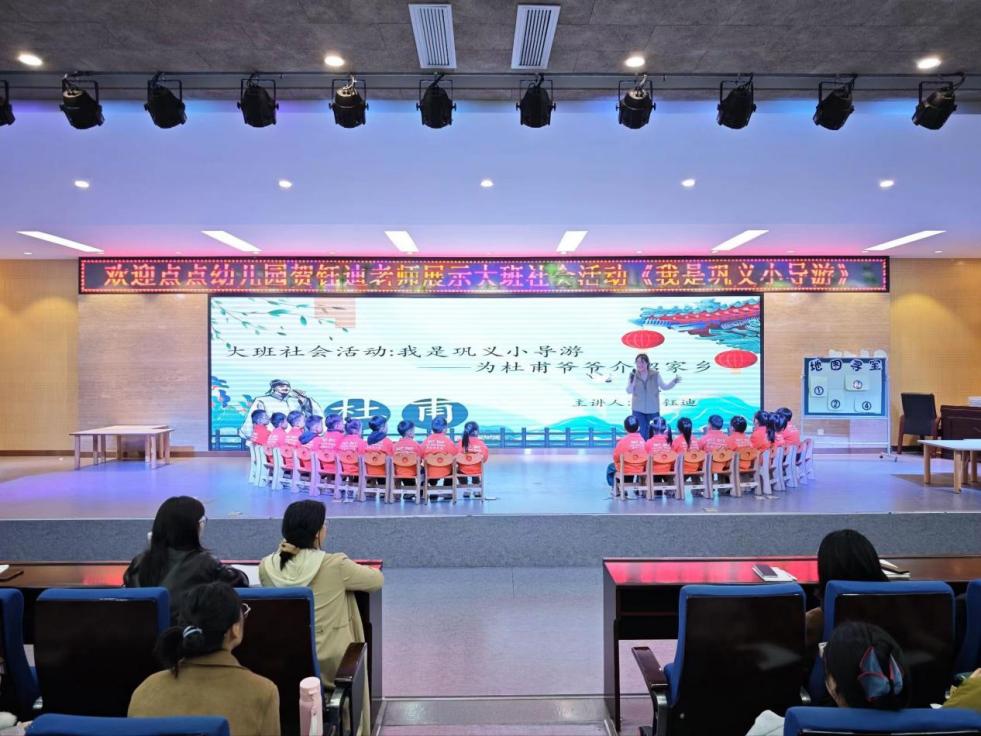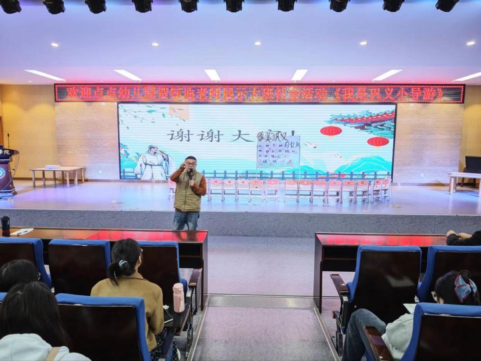 讲座伊始,点点幼儿园的贺钰迪老师化身“引路人”,带领一群天真可爱的幼儿园小朋友,以“小小主人翁”的身份,为全场带来了一场精彩的社会活动展示课《我是巩义小导游——为杜甫爷爷介绍家乡》。课堂上,贺老师以亲切活泼的语言,通过图片和互动游戏,引导孩子们认识巩义的著名地标,如宋陵公园、巩县石窟等。孩子们化身“小导游”,用稚嫩而清脆的嗓音,向台下的“大朋友们”介绍自己的家乡。活动锻炼了幼儿的语言表达能力和社交勇气,更将“爱家乡”的情感教育巧妙地融入其中,润物无声。贺老师娴熟的教学技巧、对孩子们个体差异的精准把握以及与幼儿之间自然流畅的互动,为在座的学前教育专业学生提供了鲜活、直观的教学范例,让大家深刻体会到“寓教于乐”的真谛。