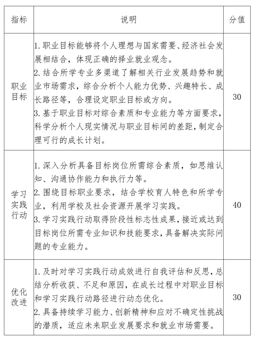 重点考察参赛选手职业发展规划的科学合理性,聚焦其为实现职业目标所付出的成长实践历程。通过以赛促学、以赛促练的方式,助力选手在持续学习与实践中稳步提升职业目标达成率,全面增强自身综合素质与求职实战竞争力。